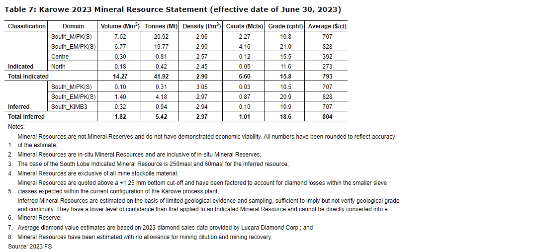 The 2023 mineral resources for Karowe, as summarized in Table 7, have been classified as either indicated or inferred mineral resources, according to CIM Definition Standards for Mineral Resources and Mineral Reserves (CIM, 2014). Mineral resources reported are inclusive of those portions of the mineral resource that have been converted to mineral reserves and have an effective date of June 30, 2023.