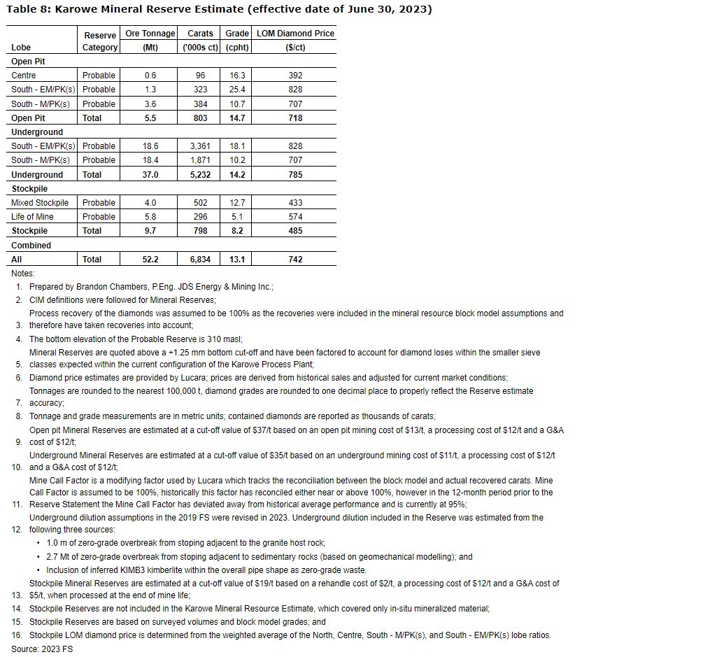 Karowe is located in north-central Botswana, one of the world's most prolific diamond-producing areas, and is a producer of large, high-value type 2a diamonds and the only diamond mine to have produced four diamonds in excess of 1,000 carats in size. The underground expansion at Karowe is expected to double the mine life, and to generate significant revenue and cash flow out to 2040, extending benefits to the company, its employees, shareholders, communities surrounding the mine and Botswana. The Report provides an update to the 2019 underground feasibility study (2019 FS) and 2021 financed base case to reflect changes to project duration, capital expenditure, and technical updates to the project. All amounts are in United States dollars unless otherwise noted.