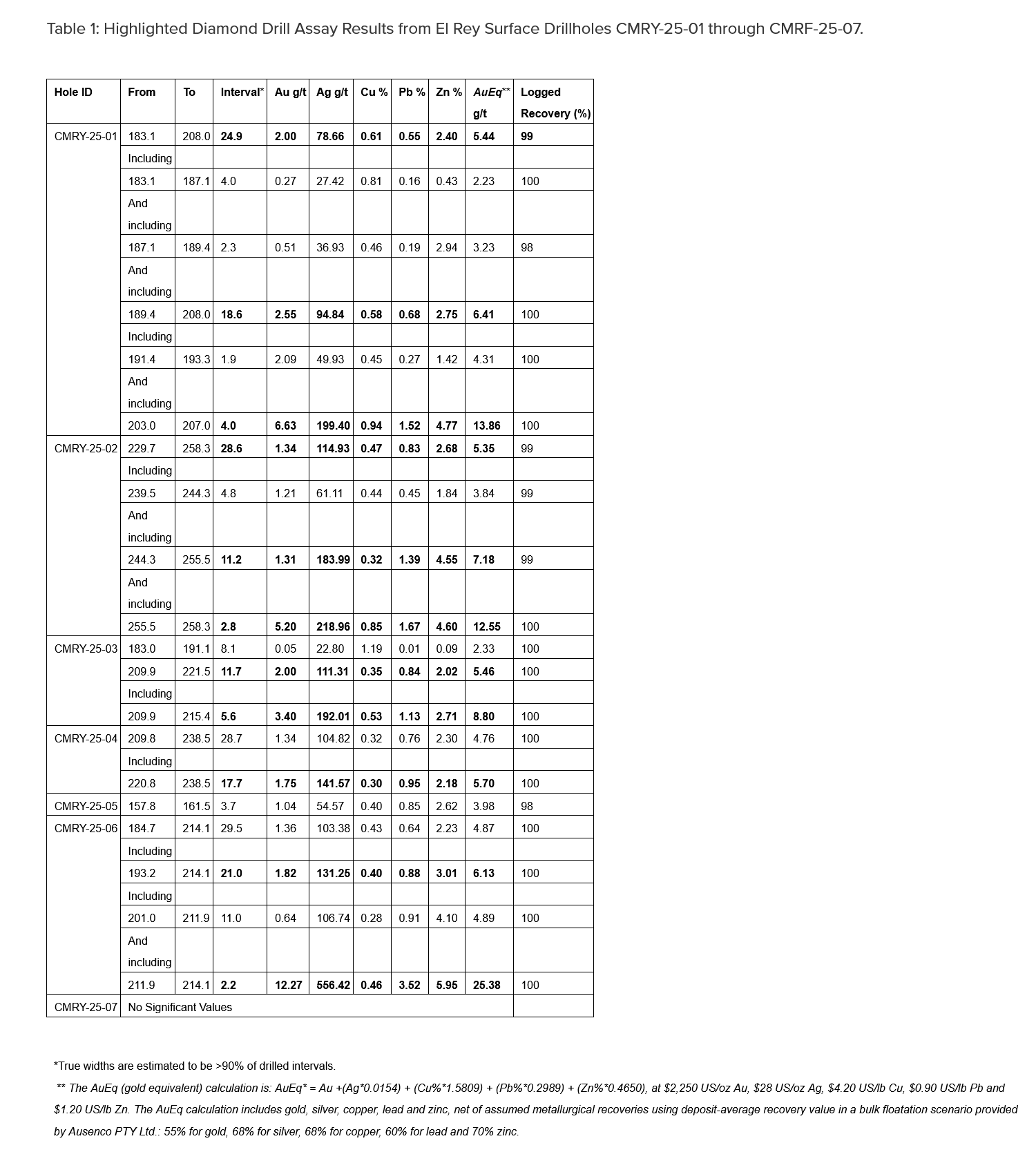 "The first drilling at El Rey in over 14 years has confirmed the presence of thick, gold- and silver-rich VMS mineralization and has meaningfully extended the deposit beyond previous interpretations, particularly along its western margin and at depth. El Rey shares key geological characteristics with the nearby Reforma deposit and represents an additional unmined source of mineralization with clear potential to support mine life extension and improve production flexibility at Campo Morado.