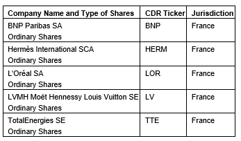 BMO EXPANDS CANADIAN DEPOSITARY RECEIPT (CDR) LINEUP INTO FRANCE, LAUNCHING FIVE NEW CDRS INCLUDING LVMH, HERMES AND TOTALENERGIES