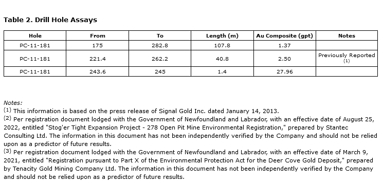 - Infill sampling of existing drill core below and to the north of the former Pine Cove open pit mine returned 1.37 grams per tonne ("gpt") Gold ("Au") over 107.8 metres ("m"); including the previously announced intersection of 2.50 gpt Au over 40.8m in drill hole PC-11-181(1). The mineralized zone is open at depth with additional sampling of adjacent drill holes underway.