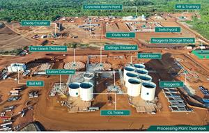 - Key process plant achievements include completion of all tanks erected on the first CIL train, ball mill foundation concrete pour, pre-leach and tailings thickeners concrete pours, and oxide circuit earthworks with concrete pour