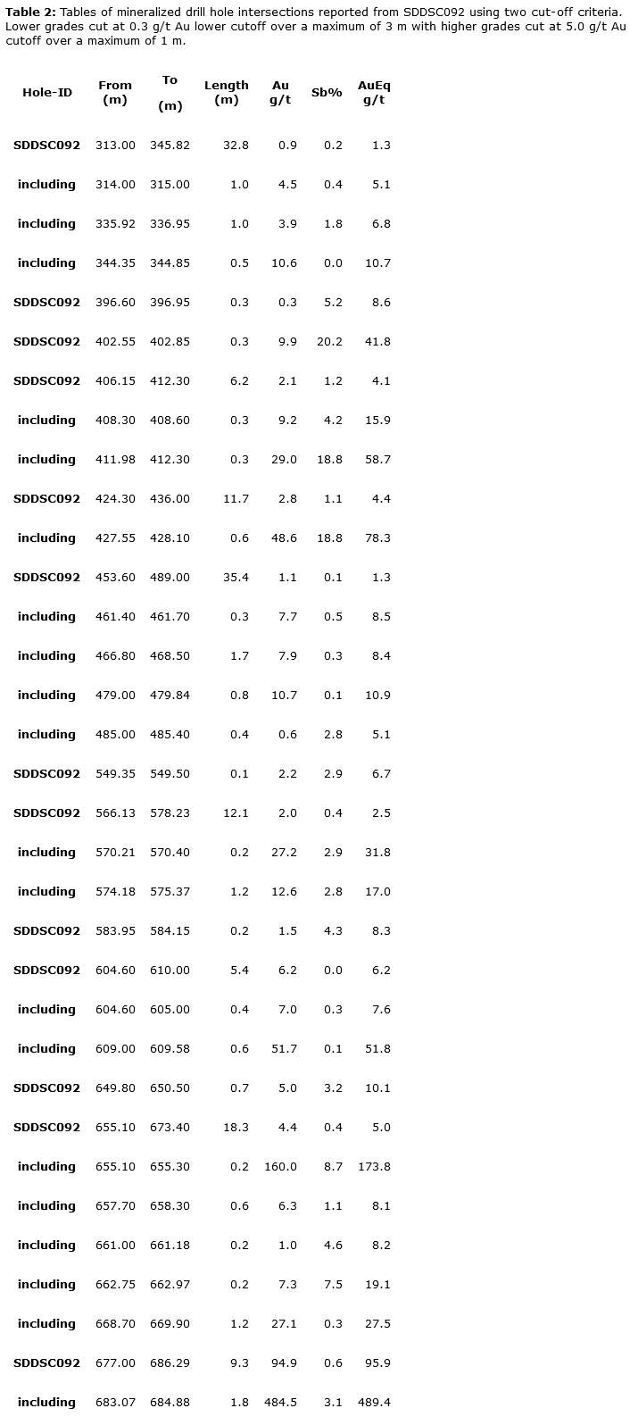 SDDSC092 drilled at the Rising Sun Prospect included 9.3 m of 95.9 g/t AuEq (94.9 g/t Au, 0.6 per cent Sb) from 677.0 m within a broader interval of 382.3 m of 3.4 g/t AuEq (3.1 g/t Au, 0.2 per centSb) from 382.3 m (uncut). The hole traversed 10 individual high grade vein sets (Figures 1-3). Twelve intervals have >20 g/t Au (up to 1,610 g/t Au), 20 intervals have >15 g/t Au and 8 intervals have >5 per cent Sb (up to 21.2 per cent Sb).