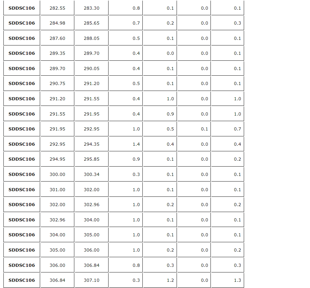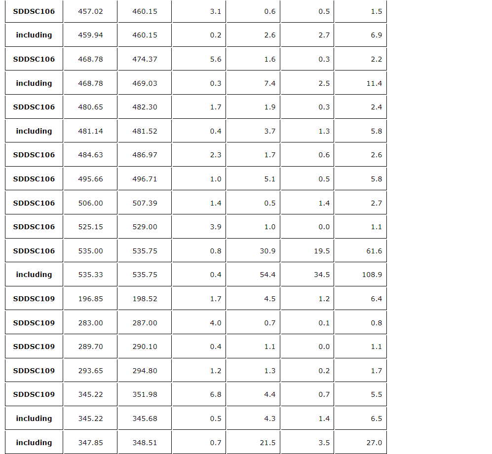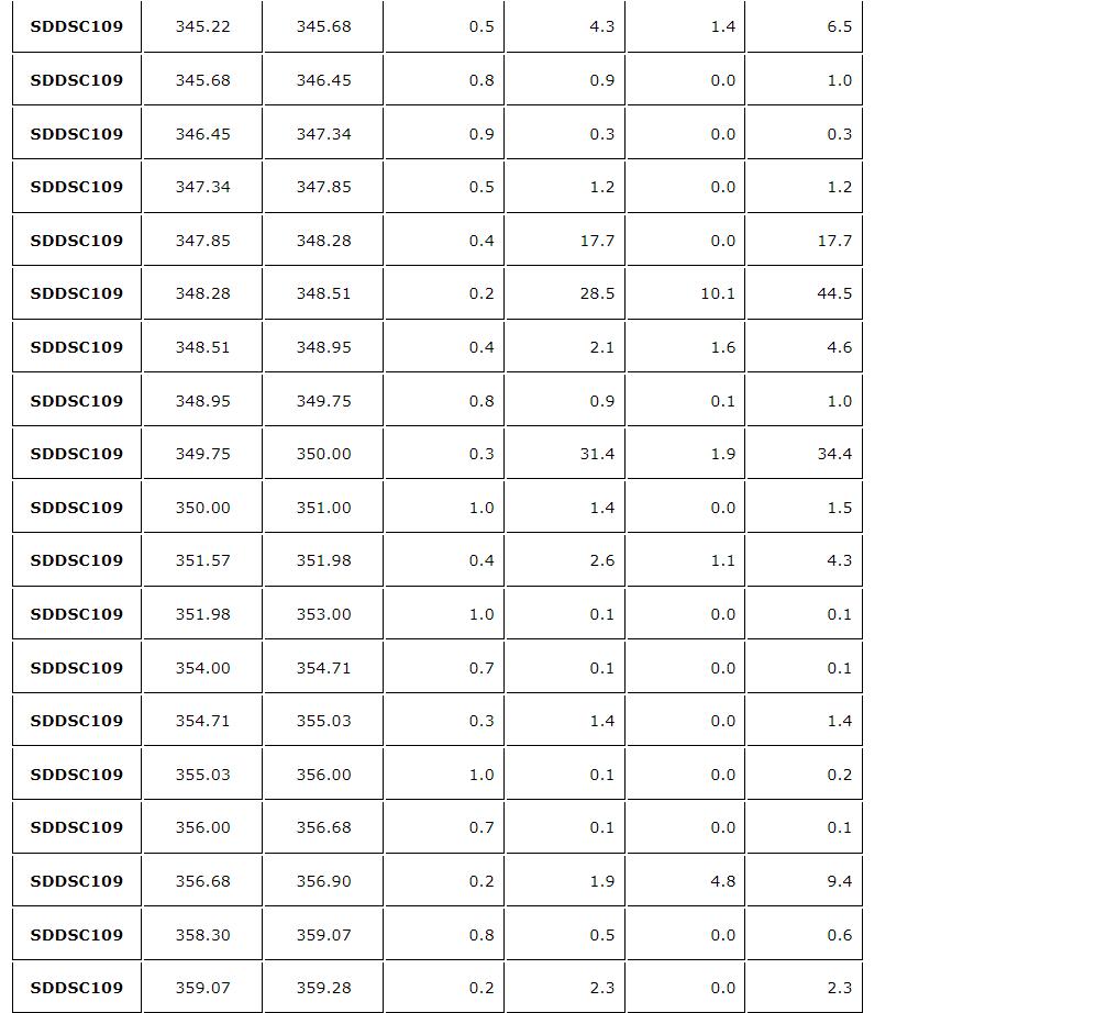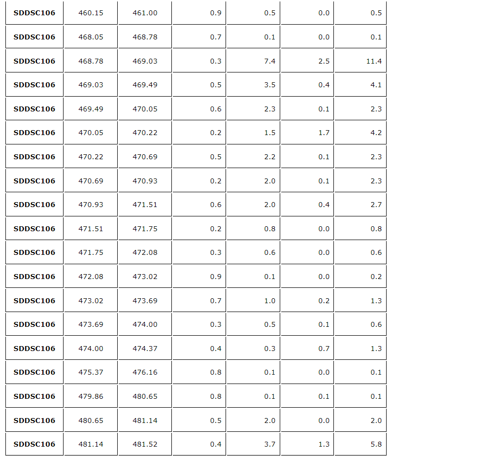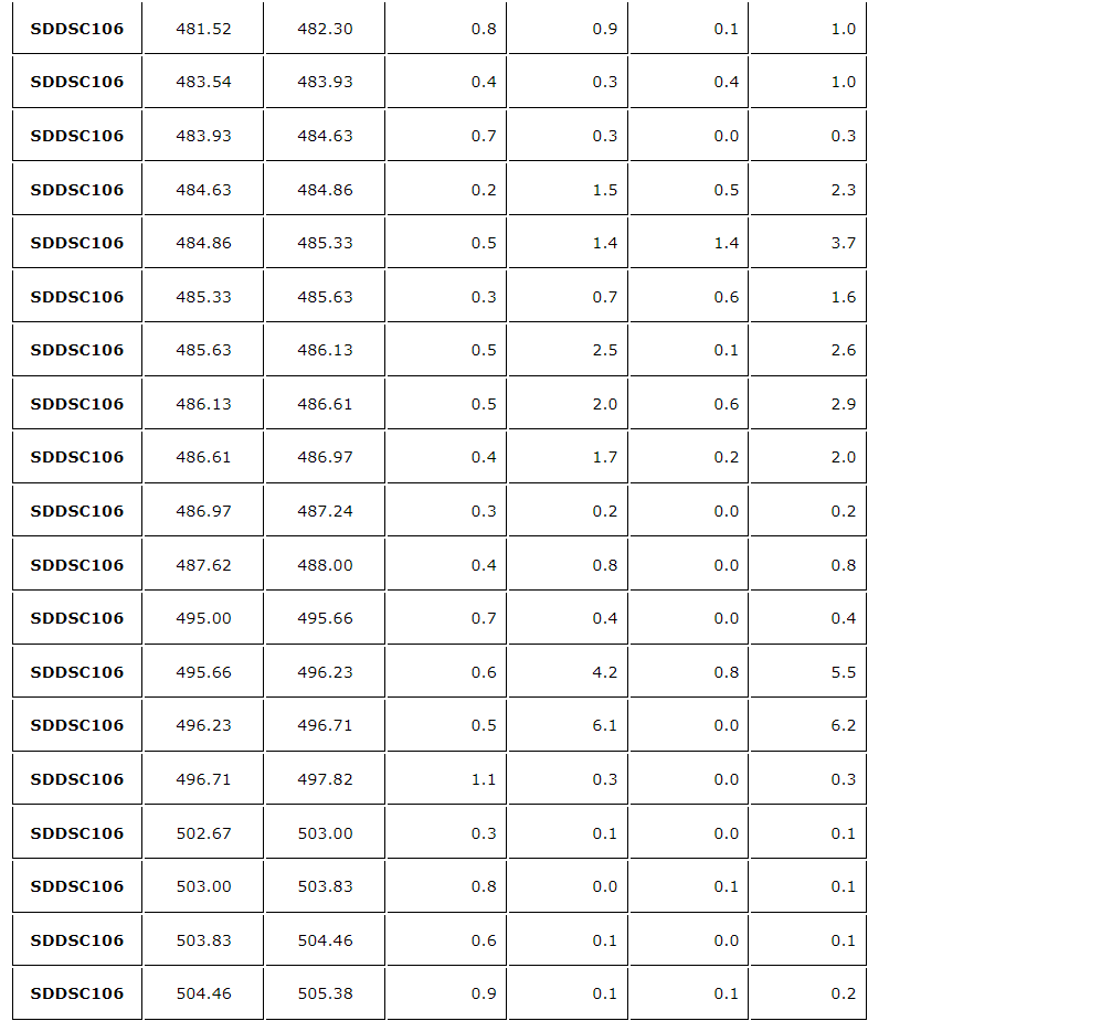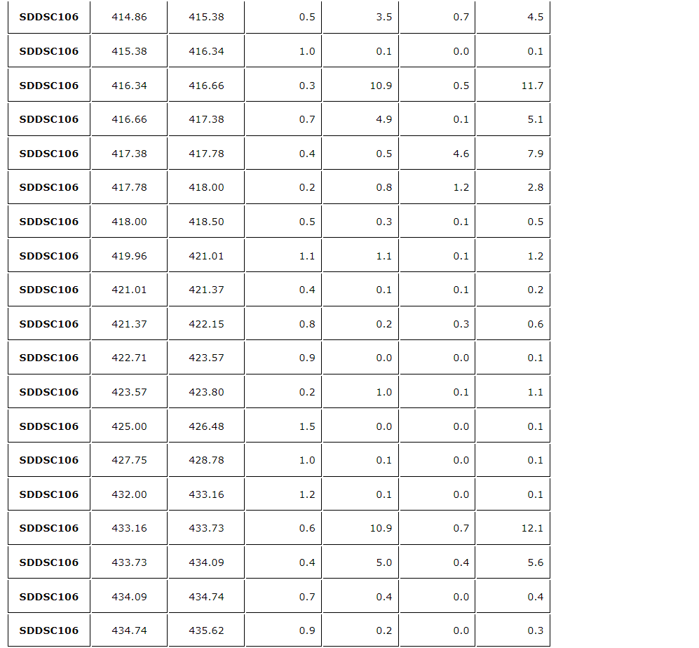 Eight holes (SDDSC107, SDDSC108A, SDDSC110, SDDSC111, SDDSC112, SDDSC112W1, SDDSC113 and SDDSC114) are currently being processed and analyzed, with three holes (SDDSC115A, SDDSC116 and SDDSC117) in progress.