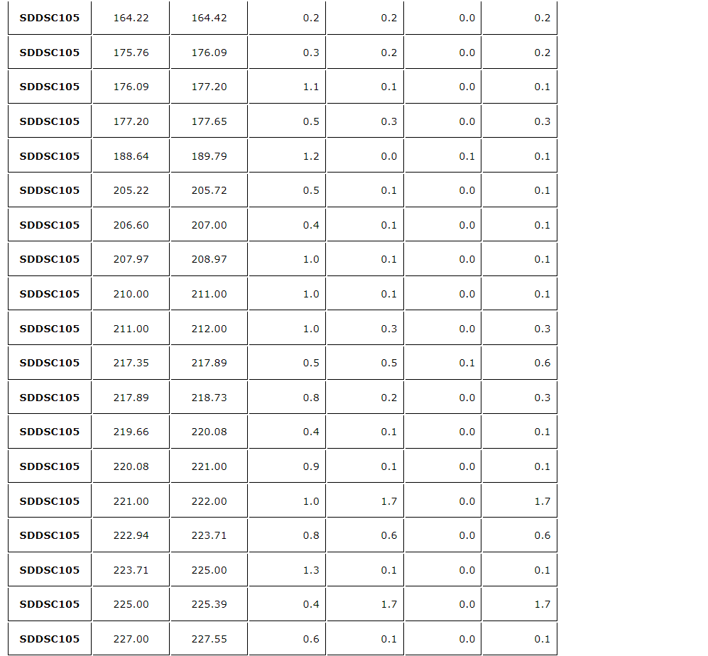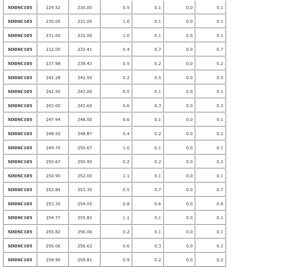 SDDSC105 was terminated early due to it deviating too far from the target. The hole intercepted near-miss alteration, including sericite-pyrite plus/minus carbonate alteration, associated with mineralization at the top of the hole over a 90 m zone (from 197 m to 287 m). Highlights included 1.0 m at 1.7 g/t Au from 221.0 m and 0.4 m at 1.7 g/t Au from 225.0 m.
