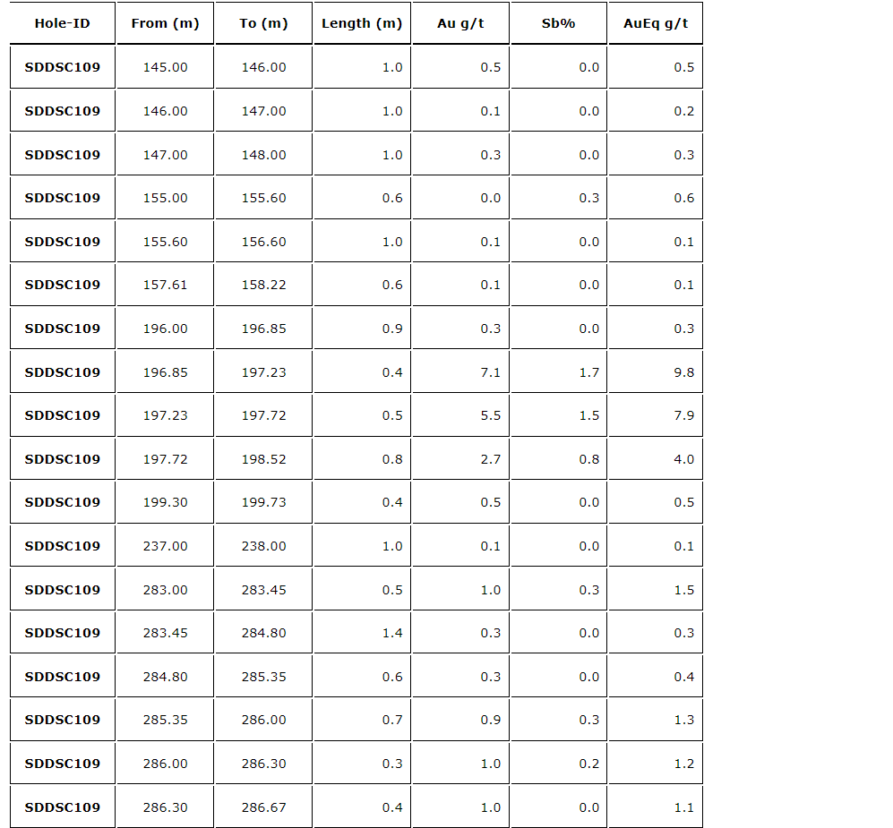 - SDDSC109 was drilled parallel to, and 70 m to 120 m up dip of, SDDSC106. It traversed seven vein sets in total. This drill hole contains eight intervals of greater than 15 g/t Au (up to 99.8 g/t Au) and five intervals of greater than 5 per cent Sb (up to 33.8 per cent Sb). Selected highlights include: