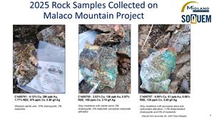 In 2026, the parties have confirmed the continuation of the Alliance with a joint annual exploration budget of $1 million (50% Midland and 50% SOQUEM) on the Malaco Mountain and Nachicapau projects.