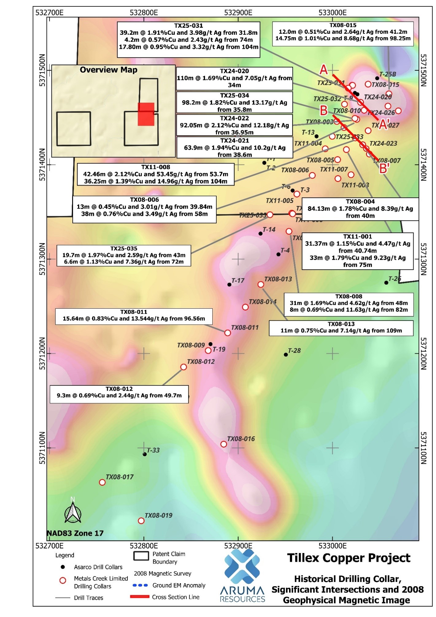 Figure 2: Tillex Project map showing significant previous drilling intersections.