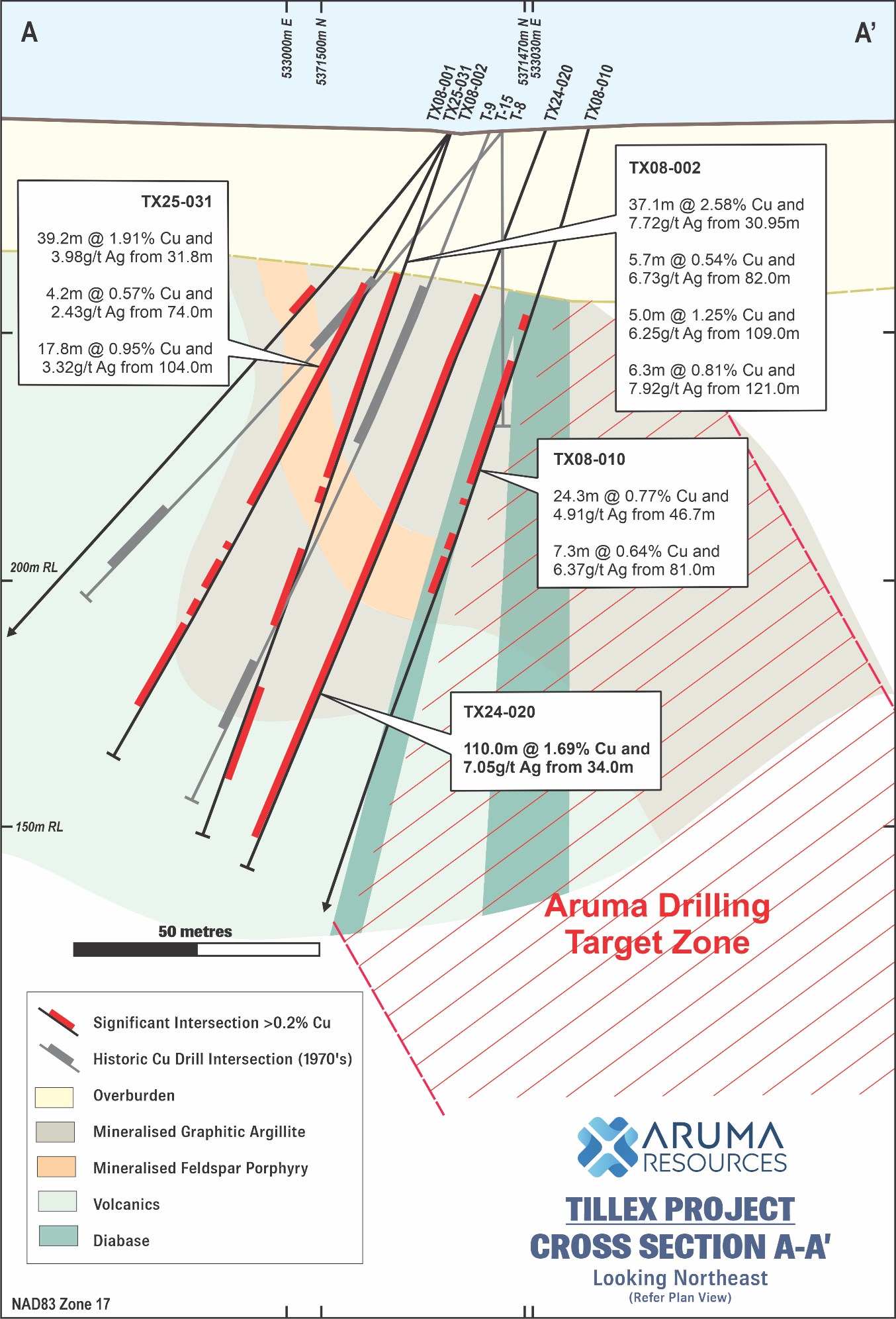 - 110m @ 1.69% Cu and 7.05g/t Ag from 34m (TX24-020), including