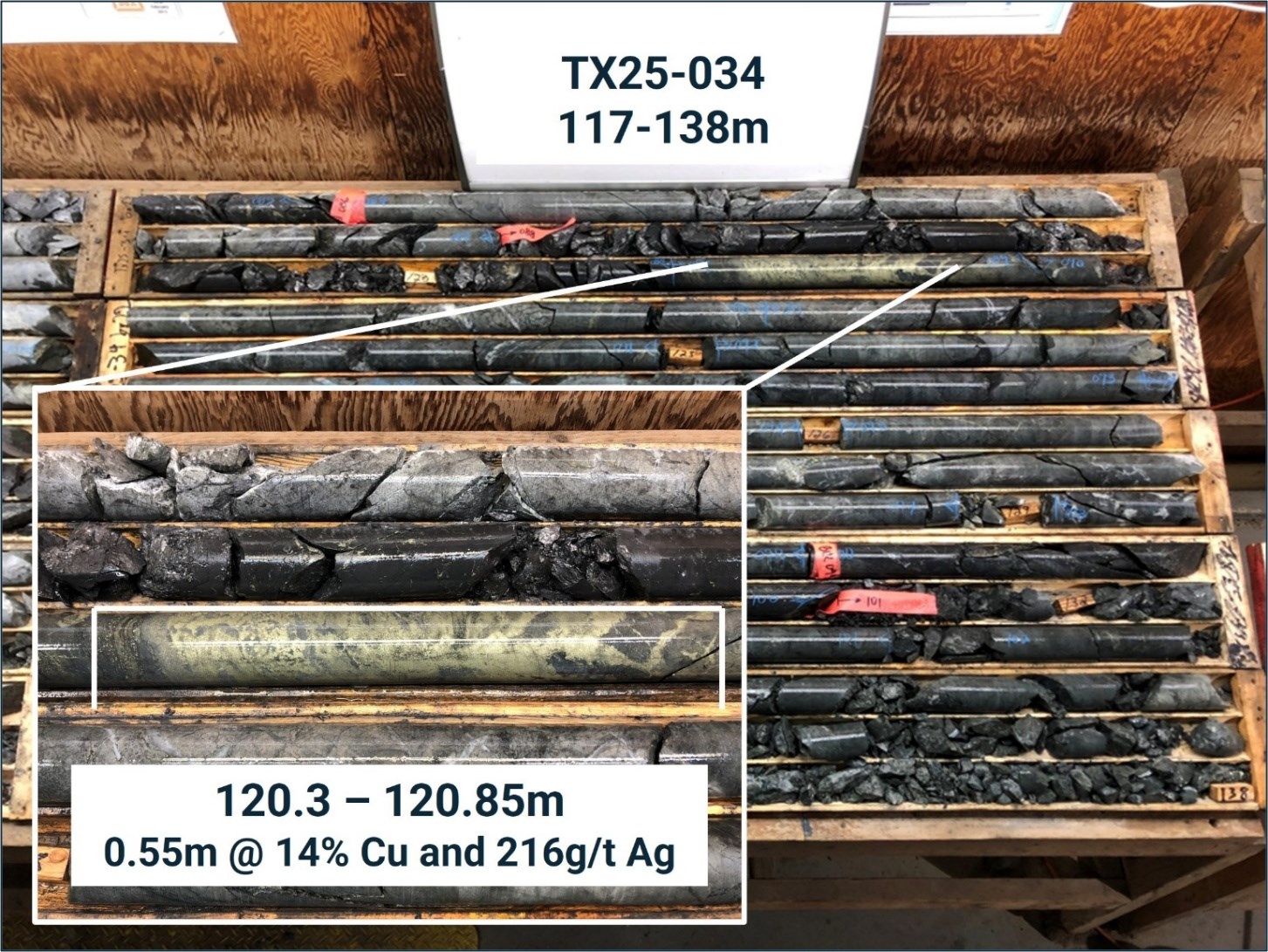 - 98.2m @ 1.82%Cu and 13.17g/t Ag from 35.8m (TX25-034)