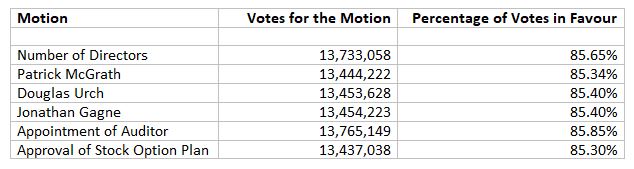 Votes representing 16,033,429 shares were cast, representing 60.72 per cent of the issued and outstanding shares at the record date. A summary of the meeting results is outlined in the attached table.