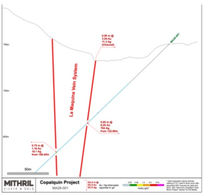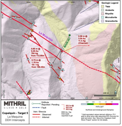 One hole at La Maquina was completed to test the down dip extension of a new vein discovery on surface in an area where no historical workings are known to exist.  Channel sampling conducted by Mithril returned grades of up to 3.54 g/t gold, 11.3 g/t silver, or 3.7 g/t AuEq over 0.5 m. The drill hole intercepted the projected vein 68 metres down dip from the surface within the granodiorite intrusive, with mineralisation characterised as concordant veining with banding and microbands of black sulphides .  Vein continuity seen in mapping and sampling to the northwest remains a favourable target for future drill testing.  La Maquina drilling highlights are listed in Table 1.