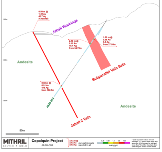 0.50 m @ 6.91 g/t gold, 475 g/t silver from 102.50 m ( JA26-004)