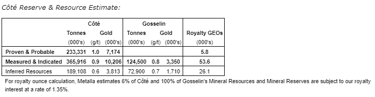 For royalty ounce calculation, Metalla estimates 6 per cent of Cote and 100 per cent of Gosselin's Mineral Resources and Mineral Reserves are subject to our royalty interest at a rate of 1.35 per cent.