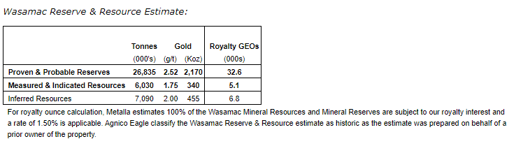 For royalty ounce calculation, Metalla estimates 100 per cent of the Wasamac Mineral Resources and Mineral Reserves are subject to our royalty interest and a rate of 1.50 per cent is applicable. Agnico Eagle classify the Wasamac Reserve & Resource estimate as historic as the estimate was prepared on behalf of a prior owner of the property.