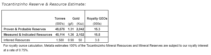 Metalla holds a 0.75 per cent Gross Value Royalty interest on Tocantinzinho.