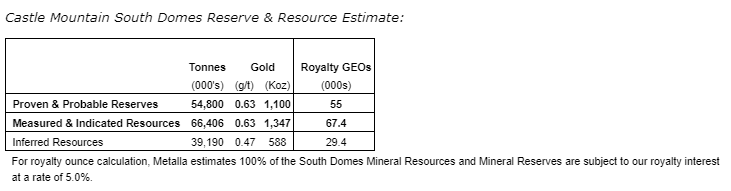 For royalty ounce calculation, Metalla estimates 100 per cent of the South Domes Mineral Resources and Mineral Reserves are subject to our royalty interest at a rate of 5.0 per cent.