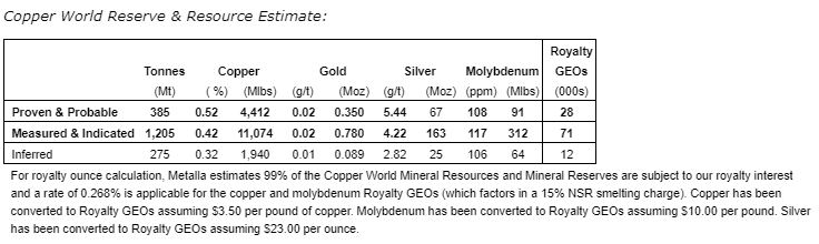 For royalty ounce calculation, Metalla estimates 99 per cent of the Copper World Mineral Resources and Mineral Reserves are subject to our royalty interest and a rate of 0.268 per cent is applicable for the copper and molybdenum Royalty GEOs (which factors in a 15 per cent NSR smelting charge). Copper has been converted to Royalty GEOs assuming $3.50 per pound of copper. Molybdenum has been converted to Royalty GEOs assuming $10 per pound. Silver has been converted to Royalty GEOs assuming $23 per ounce.
