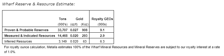 For royalty ounce calculation, Metalla estimates 100 per cent of the Wharf Mineral Resources and Mineral Reserves are subject to our royalty interest at a rate of 1.0 per cent.