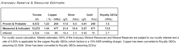 For royalty ounce calculation, Metalla estimates 100 per cent of the Aranzazu Mineral Resources and Mineral Reserves are subject to our royalty interest and a rate of 0.85 per cent is applicable for the copper Royalty GEOs (which factors in a 15 per cent NSR smelting charge). Copper has been converted to Royalty GEOs assuming $3.50/lb. Silver has been converted to Royalty GEOs assuming $23/oz