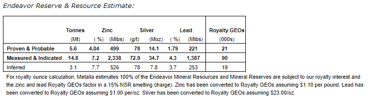 For royalty ounce calculation, Metalla estimates 100 per cent of the Endeavor Mineral Resources and Mineral Reserves are subject to our royalty interest and the zinc and lead Royalty GEOs factor in a 15 per cent NSR smelting charge). Zinc has been converted to Royalty GEOs assuming $1.10 per pound. Lead has been converted to Royalty GEOs assuming $1 per/oz. Silver has been converted to Royalty GEOs assuming $23/oz.