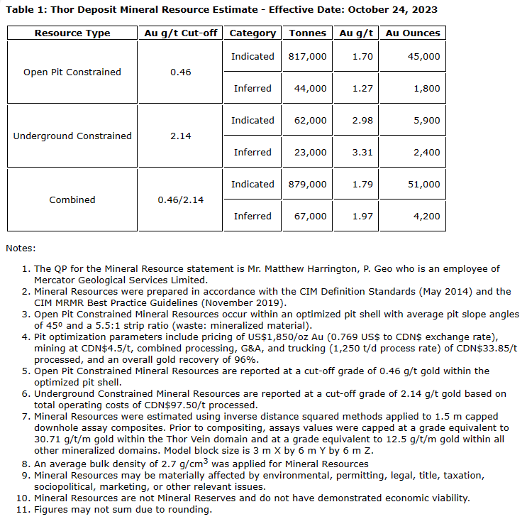 The Updated Mineral Resource Estimate for the Thor Deposit comprises open-pit constrained Indicated Mineral Resources of 817,000 tonnes at an average grade of 1.70 g/t gold for 45,000 ounces and open-pit constrained Inferred Mineral Resources of 44,000 tonnes at an average grade of 1.27 g/t gold for 1,800 ounces at a cut-off grade of 0.46 g/t gold. The Thor Deposit also includes underground constrained Indicated Mineral Resources of 62,000 tonnes at an average grade of 2.98 g/t gold containing 5,900 ounces and underground constrained Inferred Mineral Resources of 23,000 tonnes at an average grade of 3.31 g/t gold containing 2,400 ounces at a cut-off grade of 2.14 g/t gold (Table 1). The Effective Date of the Mineral Resource Estimate is October 24, 2023.