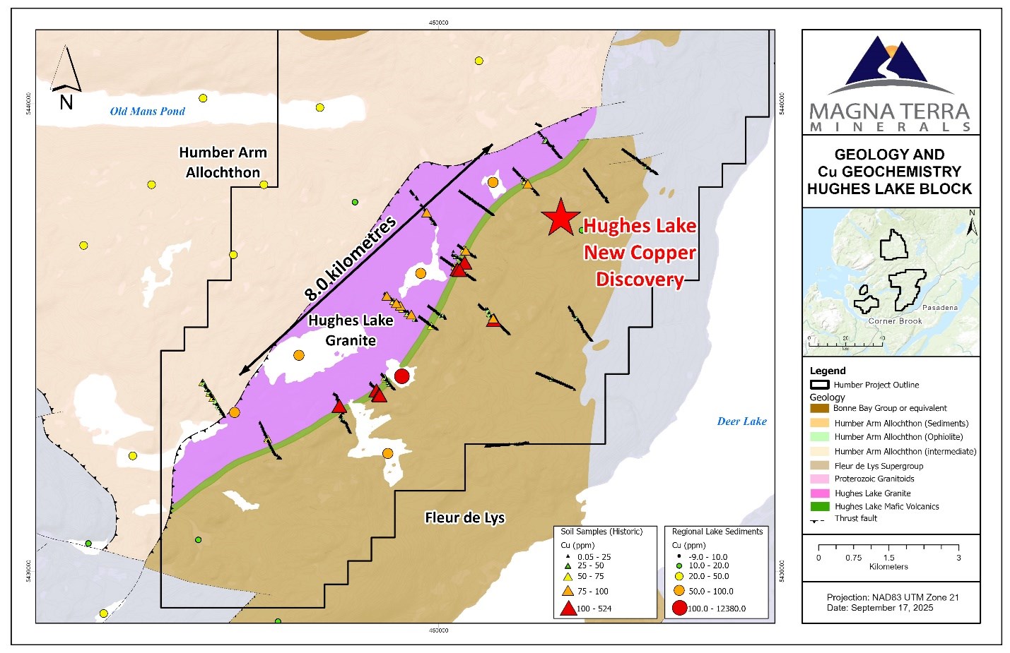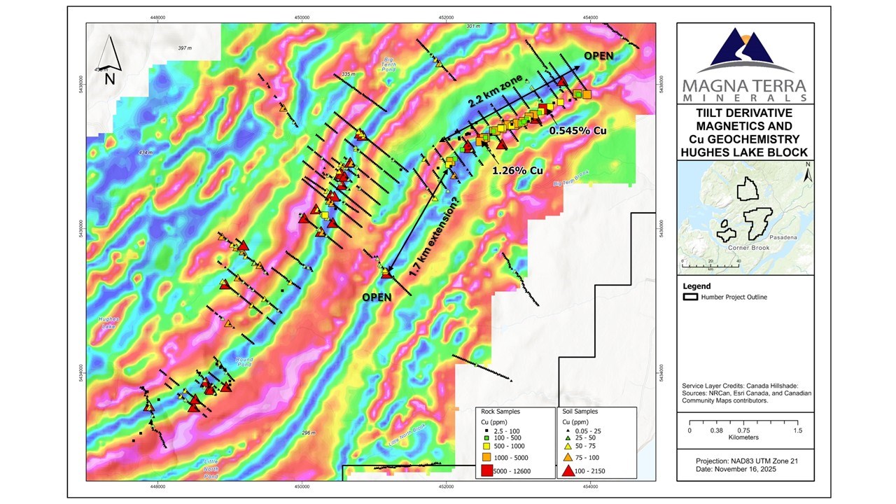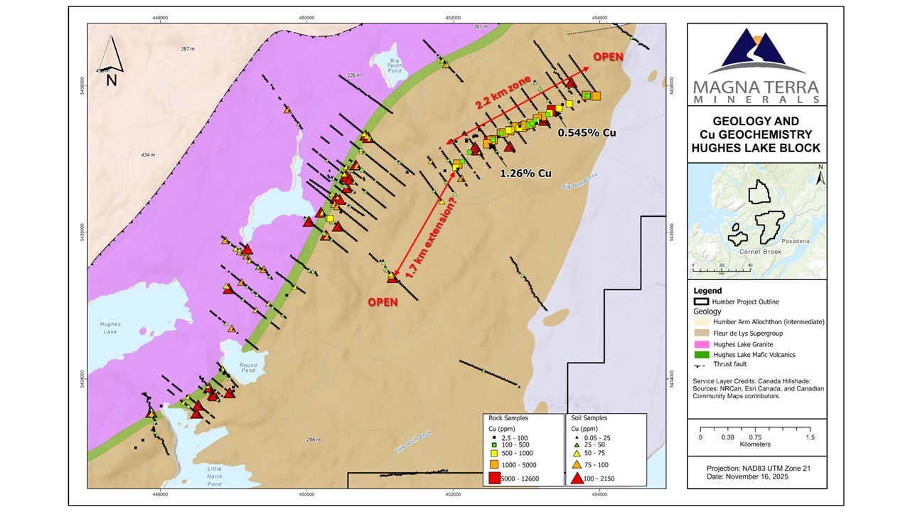 Toronto, Ontario--(Newsfile Corp. - November 18, 2025) - Magna Terra Minerals Inc. (TSXV: MTT) ("Magna Terra" or the "Company") is pleased to announce that it has received analytical results from a soil geochemical survey over its recently discovered zone of copper mineralization along the Hughes Lake Trend at its 100% owned Humber Copper-Cobalt Project (the "Humber Project" or the "Project") located in western Newfoundland. The Company has also received additional rock grab sample assays from the discovery area that outline the 2.2-kilometre long and recently expanded zone (see news release dated November 4, 2025 (Figures 1, 2, 3, and 4).