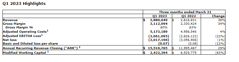 - Revenue grew to $3.88-million in Q1 2023, up 38 per cent from $2.81-million in Q1 2022, and up 7 per cent sequentially from Q4 2022. The increases are due strong new customer acquisition net dollar retention from existing customers, and the impact of a strong United States dollar.