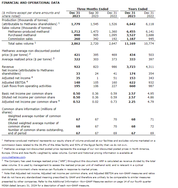 The information set forth in this news release summarizes Methanex's key financial and operational data for the fourth quarter of 2023. It is not a complete source of information for readers and is not in any way a substitute for reading the fourth quarter 2023 management's discussion and analysis (MD&A) dated Jan. 31, 2024, and the unaudited condensed consolidated interim financial statements for the period ended Dec. 31, 2023, both of which are available from the investor relations section of the company's website. The MD&A and the unaudited condensed consolidated interim financial statements for the period ended Dec. 31, 2023, are also available on the Canadian Securities Administrators' SEDAR+ website and on the United States Securities and Exchange Commission's EDGAR website.