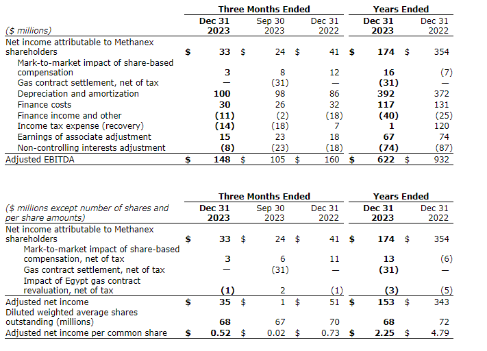 For the year ended Dec. 31, 2023, Methanex reported net income attributable to Methanex shareholders of $174-million ($2.57 net income per common share on a diluted basis), adjusted EBITDA of $622-million and an adjusted net income of $153-million ($2.25 adjusted net income per common share). This compares with a net income attributable to Methanex shareholders of $354-million ($4.86 net income per common share on a diluted basis), adjusted EBITDA of $932-million and an adjusted net income of $343-million ($4.79 adjusted net income per common share) for the year ended Dec. 31, 2022.