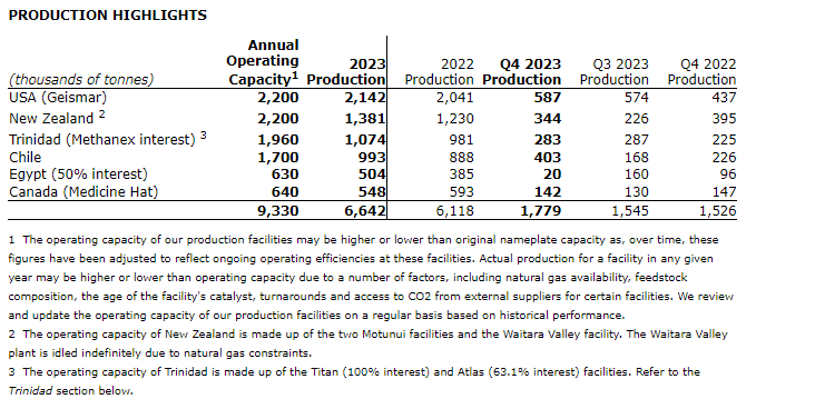 • Production for the fourth quarter of 2023 was 1,779,000 tonnes compared with 1,545,000 tonnes for the third quarter of 2023. Fourth quarter production was higher compared with the third quarter due to higher production in Chile, New Zealand, Geismar and Medicine Hat which was partially offset by lower production in Egypt.