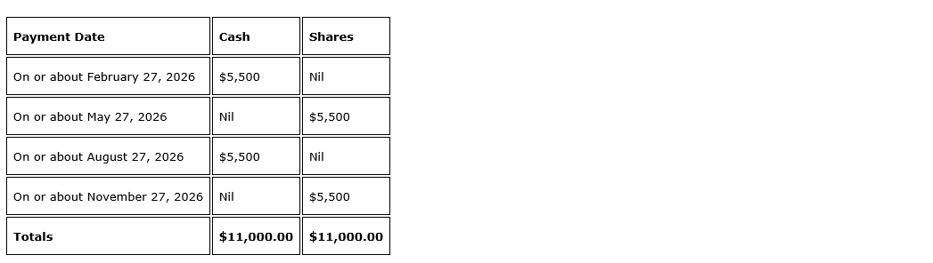 The company and the consultant have agreed the services to be received during the 2026 year of an aggregate value of $22,000 will be paid as $11,000 in cash and $11,000 in shares, plus applicable taxes, after the company has received the services as outlined in the attached table.