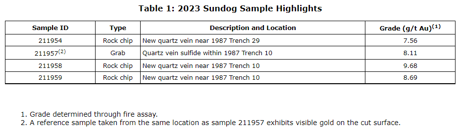 New Break Resources Ltd. has released the results from rock chip and grab samples taken from the Sundog gold project in Kivalliq region, Nunavut, and has identified new gold-bearing structures on the property, with half of the eight samples taken grading over 7.5 grams per tonne (g/t) gold (Au), as shown in the table entitled "2023 Sundog sample highlights."