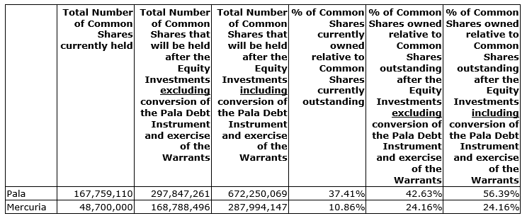 The total number of common shares to be issued pursuant to the equity investments (excluding conversion of the Pala debt instrument and exercise of the warrants) is 250,176,647, which represent approximately 56 per cent relative to the number of common shares currently issued and outstanding. The total number of common shares to be issued pursuant to the equity investments (including conversion of the Pala debt instrument and exercise of the warrants) is 743,785,105, which represent approximately 166 per cent relative to the number of common shares currently issued and outstanding.