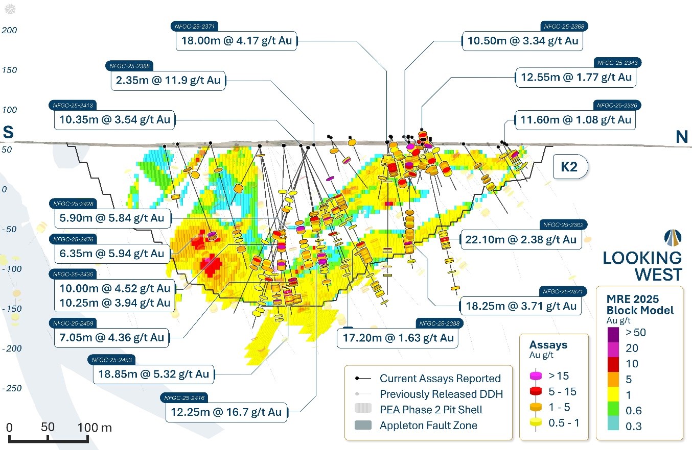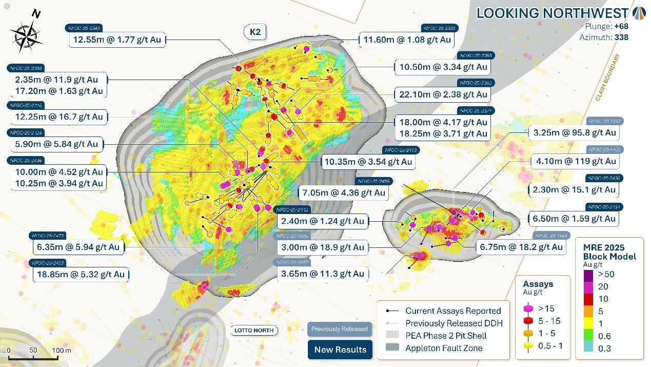 The results presented in this release include infill and expansion drilling within the Phase 1 open pit at K2 and infill drilling within the Phase 1 open pit at Jackpot, as outlined in the Company's Preliminary Economic Assessment ("PEA") on the AFZC (see the New Found Gold news release dated July 21 2025; Figures 1 to 3).