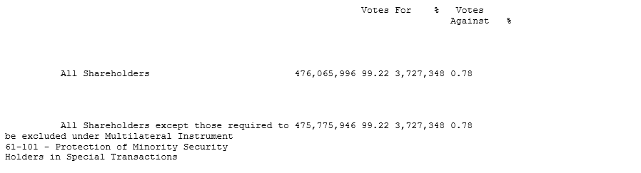 The voting results for the arrangement resolution are detailed in the attached table.