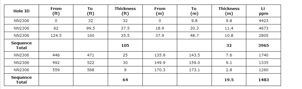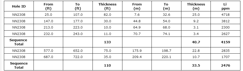 Greg Reimer, chief executive officer and director, commented: "Today's diamond drilling results, combined with previous sonic and RC results, are starting to outline a large volume of greater than 4,000 ppm Li within our upper clay horizon at the NNLP. Additionally, the deeper mineralization intersected in NN2308 is promising; it validates our interpretations and provides a critical exploration target in tracing this mineralization up dip to the east, where it is expected to approach the surface. Finally, the twinning of NN2208 bolsters our confidence in the assay results from the 2022 reverse circulation drilling. We look forward to following up these exciting results in the future."