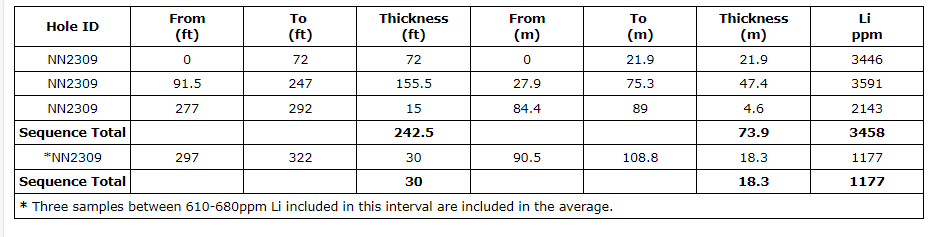 Drilled to a total depth of 132 m (433 ft), hole NN2309 was designed to investigate deeper mineralization beneath last year's reverse circulation hole NN2208 and to compare results obtained in the reverse circulation versus diamond core drilling. This diamond core hole confirmed grades observed in reverse circulation drilling with results including high grades averaging 3,446 ppm Li over 21.9 m, 3,591 ppm Li over 47.4 m and 2,143 ppm Li over 4.6 m. Results for the upper clay intervals intersected in NN2208 were similar with an overall positive difference of 9 per cent for core as compared with RC. Continued drilling revealed another mineralized clay zone of 1,177 ppm Li over 18.3 m, which increases the thickness of the mineralization at this location by 19 per cent.
