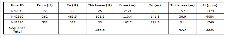 Drilled to a total depth of 303.89 m (997 ft), hole NN2310 was collared at the same pad as NN2307 but angled at 50 degrees to the east. This diamond core hole was designed as a 100 m (about 330 ft) stepout to the east of NN2307 and to better define the geometry of the shallow-dipping mineralized horizons. NN2310 returned positive sample results up to 5,660 ppm Li. These results include three contiguous mineralized horizons averaging 1,479 ppm Li over 7.6 m, 4,084ppm Li over 30.9 m and 1,749 ppm Li over 9.1 m. The thick and high-grade middle horizon averaging greater than 4,000 ppm Li correlates to intercepts in 2022 and 2023 holes positioned between 550 and 1,550 metres away. A structure is interpreted from geophysics to have faulted out the lowest horizon encountered in NN2307.