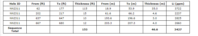 Drilled to a total depth of 207.87 m (682 ft), hole NN2311 was designed to investigate deeper mineralization beneath this year's sonic hole NN2302 and to compare results obtained in the sonic versus diamond core drilling. This diamond core hole confirmed grades observed in sonic drilling with results including high grades up to 5,200 ppm Li and horizons averaging 3,722 ppm Li over 34.9 m, 2,237 ppm Li over 4.6 m, 2,825 ppm Li over three m and 2,660 ppm Li over four m. The deeper drilling adds seven m of 2732 ppm Li mineralization to the mineralized sequence thickness at this location. Evidence from core photos, geophysics, and the offset of lithium clay horizons between the six-metre high-grade bed at 61.4 to 65.9 m and comparable bed from NN2302 suggests a fault runs directly through these two holes.