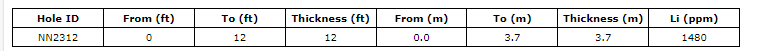Drilled to a total depth of 199.03 m (653 ft), hole NN2312 defines the limits of high-grade mineralization to the northwest at this time. This diamond core hole intercepted a mineralized horizon at surface averaging 1,480 ppm Li over 3.7 m. The Surge team has observed evidence of displacement by structures in the core and geophysics data. The current interpretation suggests this location is an uplifted horst block where mineralized sediments have been eroded off. Additionally, a large tongue of volcanic tuff was deposited directly into a lake environment in this location, which could have functioned as a source of Li in the lake and enhanced Li concentrations in the deeper parts of the basin. The 2023 geophysical surveys indicate a low-resistivity layer that aligns with the upper section in NN2312 dips below the surface to the north. One additional low-resistivity horizon is also observable at depth to the north of hole NN2312.