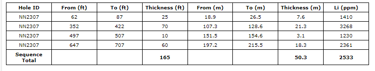 Drilled to a total depth of 235.31 m (772 ft), hole NN2307 tested for the extension of mineralization to the west of the 2022 drilling. Westward, toward the suspected basin centre, the upper mineralized horizon was expected to reside deeper below surface. This diamond core stepout hole confirmed the lateral continuity of the high-grade mineralized horizons. NN2307 returned positive sample results ranging between 1,060 ppm Li and 4,390 ppm Li. These results include four contiguous mineralized horizons averaging 1,410 ppm Li over 7.6 m, 3,268 ppm Li over 21.3 m, 1,230 ppm Li over 3.1 m and 2,361 ppm Li over 18.3 m. The upper 7.6 m thick horizon was an unexpected intercept and appears to correlate to the upper horizon at the top of NN2303, 1,500 m to the north.