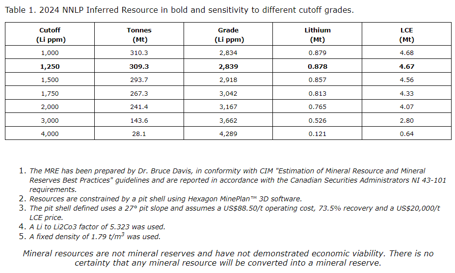 Greg Reimer, chief executive officer and director, commented: "We are thrilled with today's maiden MRE results as they solidify that the NNLP is a significant lithium deposit and one of the highest-grade lithium clay deposits worldwide. At higher grade cut-offs, there are still very appreciable volumes of lithium that are largely contained in the clay horizons nearest surface. We will continue to derisk the NNLP through metallurgical test work, technical studies and permitting. As well, we expect to continue to expand our known resource, and certainty around it, through drilling."