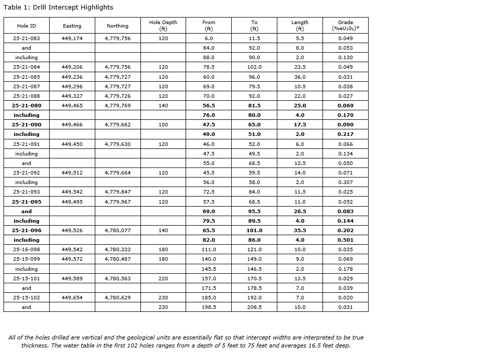 The strongest result of the drill program to date was returned from hole 25-21-096, which intersected 35.5 feet of 0.202 per cent eU3O8, including a high-grade core of 4.0 feet at 0.501 per cent eU3O8, a standout intercept for a Wyoming roll-front system. Additional strong results further demonstrate the consistency of mineralization encountered at Duck Creek, including 26.5 feet of 0.083 per cent eU3O8 with 4.0 feet at 0.144 per cent eU3O8 in hole 25-21-095. Hole 25-21-089 intersected 25.0 feet of 0.069 per cent eU3O8, including 4.0 feet at 0.17 per cent eU3O8, and hole 25-21-090 intersected 17.5 feet of 0.09 per cent eU3O8, including 2.0 feet at 0.217 per cent eU3O8.