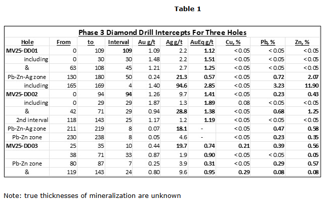 Choquelimpie drill samples have been analyzed for silver, copper, lead and zinc using the inductively coupled plasma (ICP) analytical method. Initial assay values for some samples were reported as overlimit, meaning the ICP method is not accurate above a stated maximum concentration. These samples have been reassayed by atomic absorption spectrometry (AA), a method that is accurate at the higher concentration levels. The AA results have been received for much of the phase 3 (2025) drilling, with distinct zones of silver-lead-zinc, lead-zinc and copper mineralization being intersected. Continuous base metal intercepts, along with the corresponding gold and silver concentrations, are summarized in Table 1. The primary gold intercepts, previously reported in a Norsemont press release dated Feb. 24, 2026, are also included. AuEq values are now also reported (Table 1).