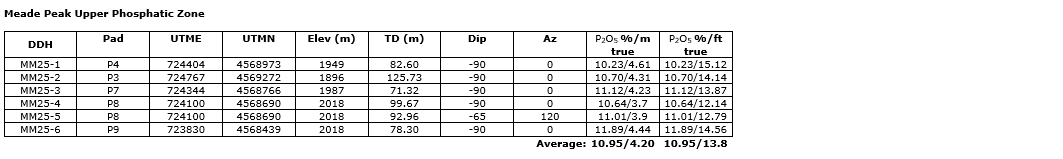 To date, the first six drill holes completed by Nevada Organic have returned an average grade of 10.95 per cent P2O5 over a true thickness of 4.20 metres (13.8 feet), consistent with the geological model for the upper phosphatic zone.