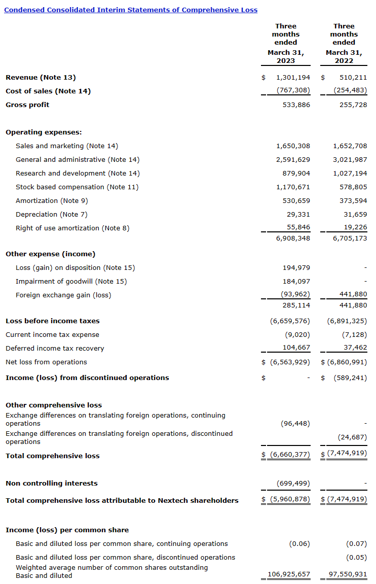 Nextech AR Solutions Corp. has released its unaudited financial and operating results for its first quarter ended March 31, 2023.