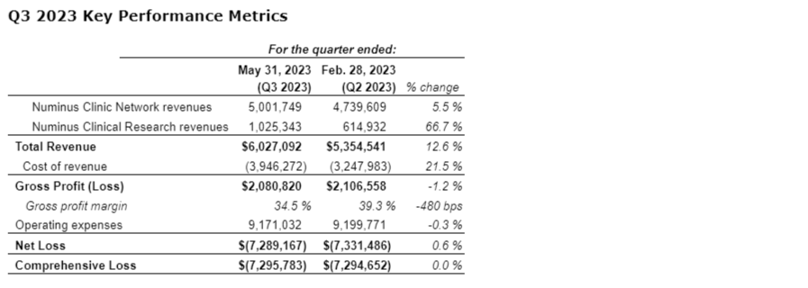 Numinus Wellness Inc. has released its financial results for the three months ended May 31, 2023 (Q3 2023).