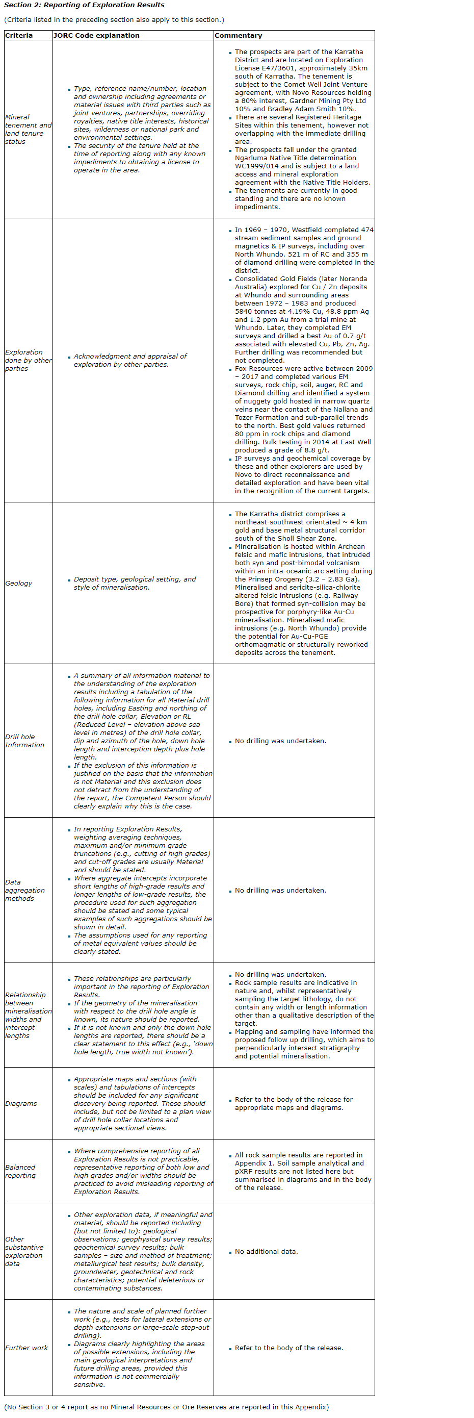 The information in this news release that relates to previously reported exploration results at Nunyerry North is extracted from Novo's announcement titled upgraded Nunyerry North drill results deliver high-grade intercepts up to 6.12 g/t Au released to ASX (Australian Securities Exchange) on March 27, 2024, and which is available to view on-line. The company confirms that the form and context in which the competent person's findings are presented have not been materially modified from the original market announcement.
