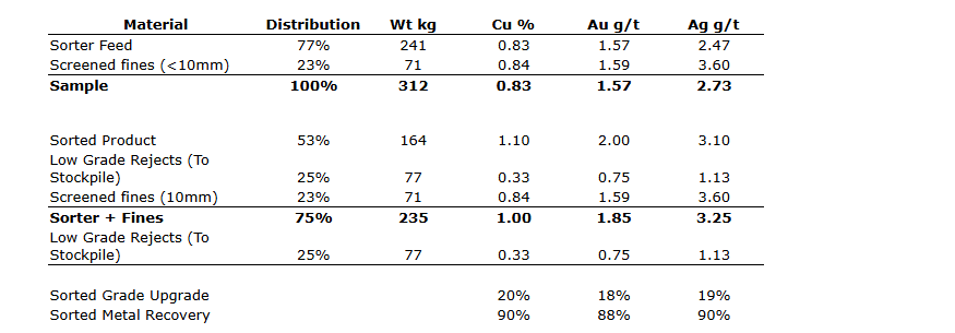 Testwork was based on operating an XRT sorting machine, processing the rock size fraction of plus 10.0 mm to 30 mm grading approximately 0.83 per cent Cu (copper), 1.57 g/t (grams per tonne) Au (gold), 2.47 g/t Ag (silver), to concentrate the sulphide-rich mineralization while rejecting the dilution taken during the mining process. The negative 10 mm material bypasses the sorting process.